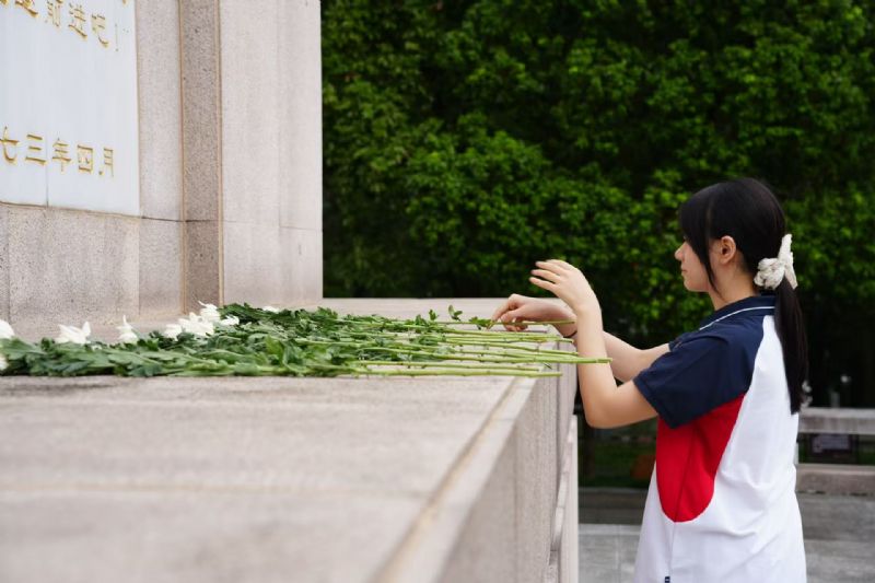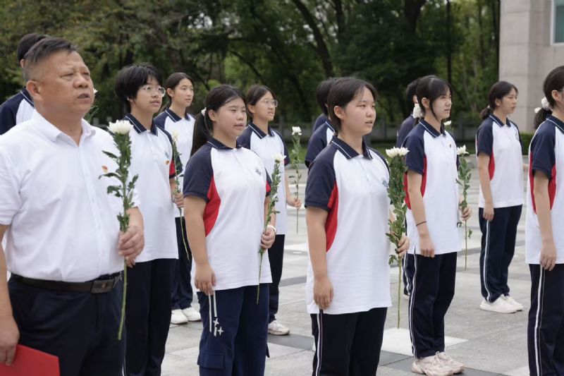 全體師生肅立,伴隨著激昂的旋律高唱國歌,嘹亮的歌聲滿含對先烈的深深敬意。